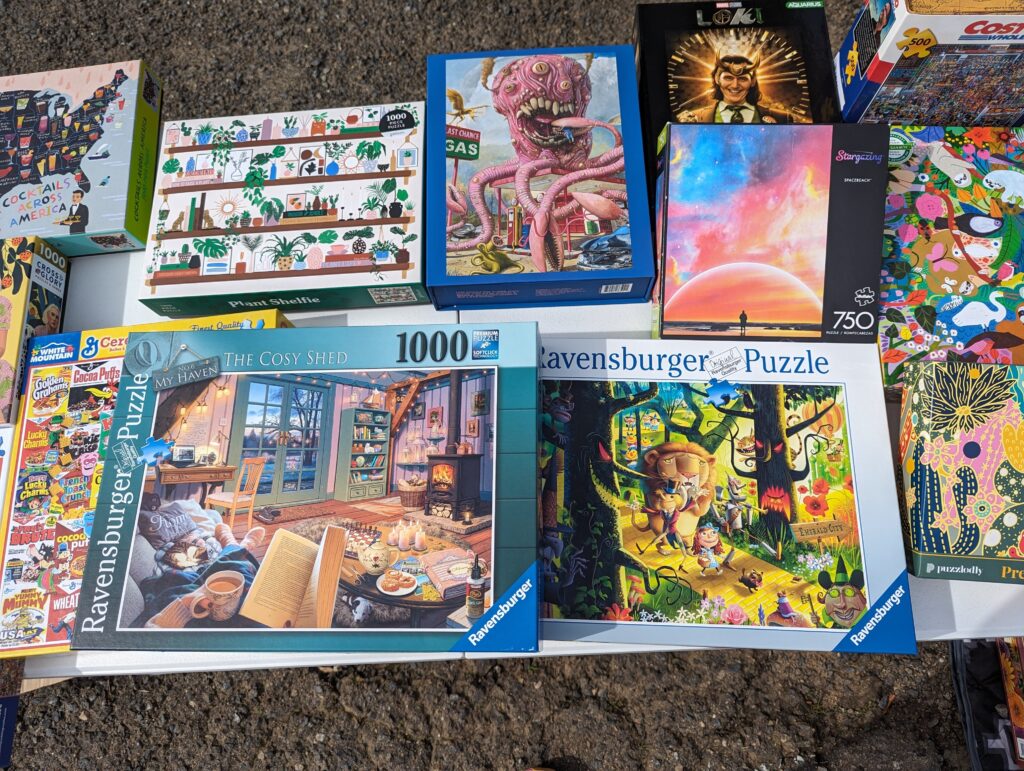 Online groups are also excellent resources for finding in-person puzzle swaps. Think swap meet, but everyone is trading the same thing, and the most popular payment method is in puzzle pieces: 1000 for 1000, 500 for 500, etc. Brand quality and condition also play significant roles in determining the value of your puzzles. I usually wait until I’ve racked up a good load of puzzles before looking for a swap event in my area.